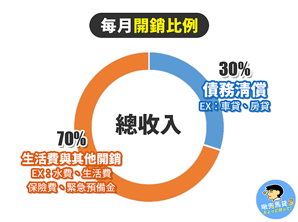 想要在負債中有資金空間可以運用,首先最重要的就是 計算貸款收支比,就是指每月收入中,有多少用於貸款,扣除必要生活費以後,剩餘的就是您可以活用的資金!