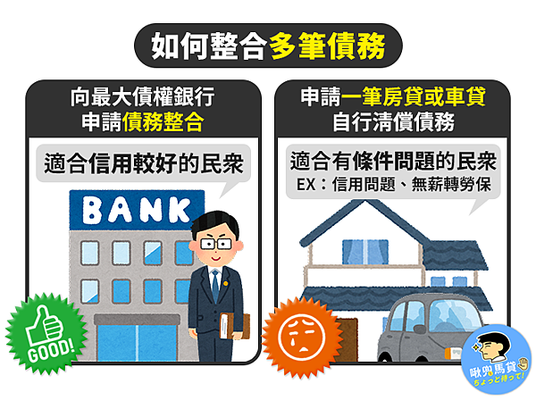 ①向最大債權銀行申請債務整合,只要穩定還款,債務整合並不影響信用,穩定繳款有助於信用提升,適合信用正常者。